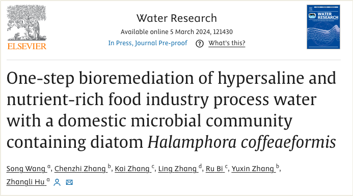 2024年3月5日,乐竞平台生命与海洋科学学院胡章立教授团队在环境领域国际顶级期刊《Water Research》(影响因子:12.8)上发表题为“One-step bioremediation of hypersaline and nutrient-rich food industry process water with a domestic microbial community containing diatom Halamphora coffeaeformis”的研究论文。