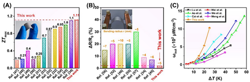 该工作采用一种新型“热扩散”工艺,设计Bi元素对Sb2Te3薄膜进行合金化。根据Sb、Bi原子与Te原子电负性以及原子半径的差异,Bi有效替代Sb原子位置,可有低Sb与Te的反位缺陷浓度,使得载流子浓度降低。根据单抛带模型理论,塞贝克系数得到了提高,热导率中的电子热导率得到了有效的降低。并且合金化形成的位错等缺陷强化了声子散射,有效降低了晶格热导率。最终薄膜在393K温度下获得了1.11的高ZT值,同时具有优良的柔韧性(在约5 mm的半径下弯曲1000次后电阻增加小于5%)。此外,还利用制备的p型BixSb2-xTe3和n型Ag2Se薄膜制造了柔性器件。因此,在25 K的温差条件下,实现了~1028 μWcm-2的出色功率密度。