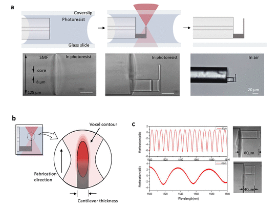 在这项工作中,我们提出的基于光纤的纳米振动传感器,其原理是光纤端面和悬臂梁组成的法布里-珀罗 (FP) 干涉仪在活体微生物悬臂梁振动时,改变了它们的光程差导致干涉动态变化。它的灵敏测试核心是通过双光子聚合(2PP) 技术将柔性 3D 打印超灵敏悬臂梁。我们在垂直方向实施2PP打印以实现更薄的悬臂,最终厚度为1微米左右。此外,飞秒激光的相对较低功率和聚合过程中相对较快的扫描速度使得聚合结构的与其杨氏模量相关的固有刚度较低,从而增大了悬臂梁的弹簧常数和检测灵敏度。悬臂梁的弹簧常数低至约0.3 N/m,与商用氮化硅AFM 悬臂处于同一数量级。作为概念验证原型,我们证明了这种基于光纤的纳米振动传感器在大肠杆菌和白色念珠菌分别对抗生素和抗真菌药物的实时敏感性测试中显示出优异的性能,检测出它们代谢活动引起的纳米或亚纳米悬臂振动。这种兼具快速响应和并行化优势的纳米振动传感器策略可能会推动该技术成为下一代纳米振动传感器,用于大规模和快速的抗菌敏感性测试以及其他技术和生物医学应用。