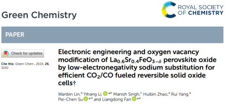 随着现代社会的快速发展,人类对于能源的需求日益增加,传统燃料的过度使用造成了大量温室气体二氧化碳(CO2)的排放,太阳能、风能等新能源又因为其不稳定性等问题限制着其有效利用。利用新能源的多余电量将CO2转化为其他可燃类气体,如一氧化碳或者碳氢燃料气体,是充分利用新能源和节能减排的有效方案。可逆固体氧化物电池(RSOCs)由于其高效的转化效率或者有利的热动力学,受到许多研究工作者的关注并将它们应用在CO2电解/CO氧化中。题为《Electronic engineering and oxygen vacancy modification of La0.6Sr0.4FeO3−δperovskite oxide by low-electronegativity sodium substitution for efficient CO2/CO fueled reversible solid oxide cells》的研究性论文由硕士研究生林万斌为第一作者,乐竞平台范梁栋研究员、西安电子科技大学李一航副教授、新加坡南洋理工大学Pei-Chen Su教授为共同通讯作者合著。乐竞平台为第一作者位和第一通讯单位。该论文受邀发表于国际期刊Green Chemistry(影响因子9.80,中科院JCR 1区)上,并被内封面highlight。