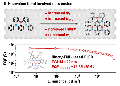 为满足下一代超高清显示要求,发展窄谱带有机发光材料是目前有机发光二极管(OLED)领域的热点问题。在此背景下,基于硼氮杂稠环体系的多重共振热活化延迟荧光(MR-TADF)材料凭借其高发光效率、高色纯度等优势,受到学术界和产业界广泛关注。然而,该类材料较长的激发态寿命使得三重态激子易于淬灭,器件效率滚降严重。如何在不牺牲窄谱带发光特性的同时缩短激发态寿命,一直是高性能MR-TADF材料发展的瓶颈。