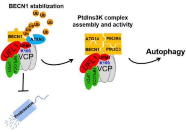 细胞自噬(Autophagy)是真核生物中进化保守的、对细胞内物质进行周转的重要过程。该过程中一些受损蛋白或细胞器被膜性小泡(自噬小泡)包裹后,与溶酶体(或液泡)融合并降解,从而得以循环利用。自噬过程与癌症、帕金森综合征和II-型糖尿病等老年疾病密切相关。犹素(UFM1)作为最晚被发现的类泛素蛋白,已被证明在胚胎发育、内质网稳态、蛋白质量控制、DDR等生命活动中起重要作用,然而在细胞自噬中的功能尚不清楚。在该研究中,许教授团队发现转位酶VCP/p97的109位赖氨酸(K109)发生UFMylation,该修饰一方面促进去泛素化酶ATXN3对BECN1的去泛素化作用,从而抑制BECN1蛋白降解,导致BECN1蛋白大量累积。作为自噬的重要起始因子,BECN1可以介导PtdIns3K复合物的形成。另一方面,UFMylation稳定VCP/p97作为支架蛋白的作用直接促进PtdIns3K复合物的形成,最终起始自噬。该研究成果揭示了UFMylation通过促进VCP/p97-ATXN3-BECN1-PtdIns3K轴起始细胞自噬的作用机理,为肿瘤、帕金森综合征和II-型糖尿病等老年疾病的诊治提供了新的思路和策略。