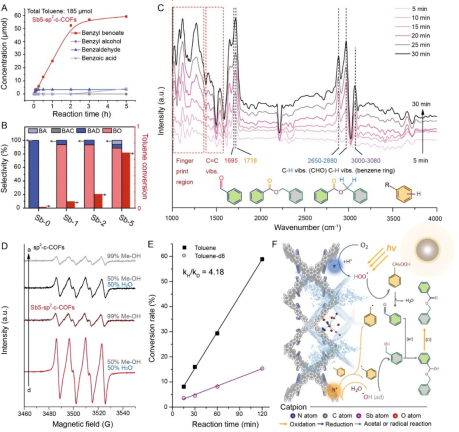材料表征表明sp2-c-COFs表面的初始接触角大于130°,引入亲水性C≡N-Sb(CN)3位点后,接触角降低至30°。载流子动力学结果表明,两者深电荷捕获寿命几乎相同,在有水的情况下Sb5-sp2-c-COFs的浅层捕获电子主要集中在表面,从而导致电荷载流子寿命大幅延长。此外,Sb-sp2-c-COFs在可极化连续模型中的ES2和ES3的载流子中心距离大幅提高,说明Sb(CN)3引入使sp2-c-COFs和水更好的发生相互作用,增加了sp2-c-COFs骨架的极化,从而促进了载流子动力学。机理研究表明,随着水的引入,Sb5-sp2-c-COFs的DMPO-·O2-峰明显增强,证实了水与Sb5-sp2-c-COFs之间的强相互作用显著改善了电荷分离。动力学同位素效应(KIE)实验显示kH/kD值为4.18,表明C(sp3)-H键活化过程可能是反应的决速步。综上,该研究工作机理为:Sb5-sp2-c-COFs上的光生电子首先将O2还原为·O2-,光生空穴同时氧化水和甲苯形成·OH (ad)和苄基自由基。随后,苄基自由基与·O2-反应生成ph-CH2OH,经脱水反应转化为苯甲醛。苄基自由基也可直接与·OH(ad)结合生成苯甲醇。生成的苯甲醇和苯甲醛在Brönsted酸的催化下反应生成半缩醛,半缩醛在溶液中被ORR相关的活性氧进一步氧化生成酯。