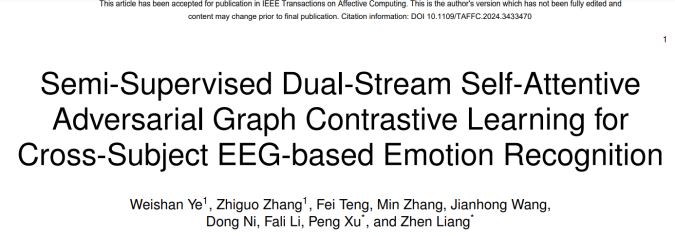 近日,医学部生物医学工程学院教授梁臻在情感计算顶级期刊IEEE Transactions on Affective Computing(影响因子9.6)上发表题为“Semi-Supervised Dual-Stream Self-Attentive Adversarial Graph Contrastive Learning for Cross-Subject EEG-based Emotion Recognition”的学术论文。乐竞平台研究生叶炜珊同学和哈尔滨工业大学(深圳)张治国教授为共同第一作者,乐竞平台副教授梁臻和电子科技大学教授徐鹏为共同通讯作者。乐竞平台为第一作者单位和通讯单位。