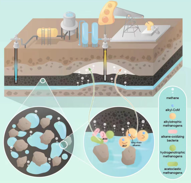 一般认为原油生物降解产甲烷是厌氧烃降解菌和产甲烷古菌合作完成的。直到2022年,承磊研究员团队、李猛教授团队及合作者发现存在一种可以直接降解长链烷基烃产甲烷的烷基型产甲烷古菌Ca. Methanoliparum,但其生态学功能尚待评估。本研究收集了我国15个地下油藏的209个样品,通过分析这些样品的原油组分、微生物组成和代谢产物,发现85%的油藏样品存在这类烷基营养型产甲烷古菌,并在其中52%的样品中检测到了烷基型产甲烷代谢的特异性中间代谢产物烷基辅酶M,表明烷基型产甲烷古菌在原油生物降解过程中可能具有重要作用。进一步通过宏基因组和宏转录组学分析发现,Ca. Methanoliparum主导了长庆、江苏和胜利油田生物降解油样中碳氢化合物的降解,且在胜利油田长达15年跨度的采集样品中均检出了Ca. Methanoliparum。本研究表明烷基型产甲烷古菌在油藏生物降解产甲烷过程中具有广泛且重要的作用,进一步拓展了我们对深部生物圈碳代谢的认知,为枯竭油藏残余原油生物气化开采(“地下沼气工程”)奠定了科学基础。