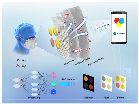 提出了一种穿戴舒适的Janus比色面罩(JCFM),通过结合机器学习K-近邻(K-NN)算法来评估呼吸氨水平。润湿性差异的Janus面料能使得呼出的湿气单向渗透,保证面部皮肤干爽舒适。比色阵列上的四种不同的pH指示剂作为与氨发生交叉反应的识别元件,通过模仿哺乳动物复杂的嗅觉结构来捕获呼吸氨的光学指纹信息。欧氏距离(ED)用于定量描述1 ppm至10 ppm之间的氨浓度,表明氨浓度与ED响应之间存在线性关系(R2=0.988),检测限可达0.62 ppm。基于RGB响应特征的K-NN算法辅助分析目标氨水平,预测准确率达到96%。该论文发表在自然指数期刊Analytical Chemistry上,乐竞平台为第一完成单位。