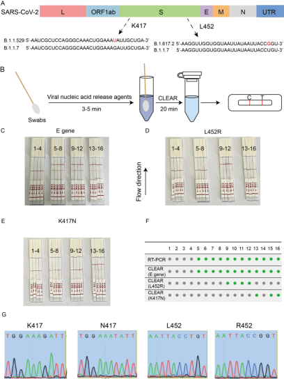 3.精准分型检测:通过编程化的crRNA设计,该系统能够精准识别K417N、K417T和L452R等单碱基突变位点,实现对SARS-CoV-2变异株的无扩增分型。实验结果显示,CLEAR体系在对标准品和临床样本的分型检测中表现优异,具备应用于多种呼吸道病原体检测的潜力。