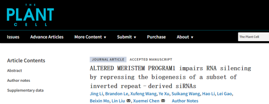 2024年11月6日,生科院刘琳副教授课题组与北京大学陈雪梅院士团队合作在Nature Index期刊The Plant Cell(1区TOP,影响因子10.0)在线发表题为“ALTERED MERISTEM PROGRAM1 impairs RNA silencing through repressing the biogenesis of a subset of inverted repeats-derived siRNAs in Arabidopsis”研究论文,揭示了AMP1和AGO1调节反向重复序列衍生的siRNA生物发生的新机制。