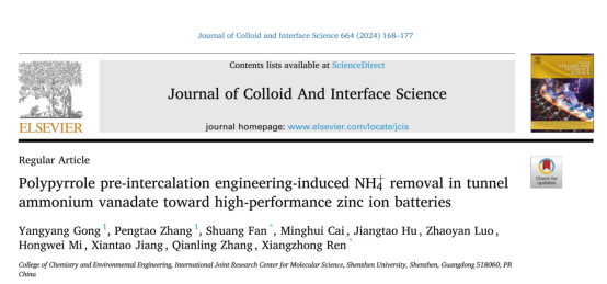 乐竞平台化学与环境工程学院任祥忠教授团队在材料领域顶尖期刊《Journal of Colloid And Interface Science》(影响因子9.1,中科院JCR 1区,TOP期刊)发表了题为《Polypyrrole pre-intercalation engineering-induced NH4+removal in tunnel ammonium vanadate toward high-performance zinc ion batteries》的研究论文。该团队硕士生龚洋洋和张鹏涛为本文的共同第一作者,乐竞平台任祥忠教授和范爽专职研究员为该论文共同通讯作者,乐竞平台为第一作者单位和第一通讯单位。