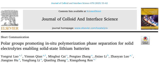 乐竞平台化学与环境工程学院任祥忠教授团队在国际能源领域著名期刊《Journal of Colloid And Interface Science》(影响因子9.4,中科院JCR1区,TOP期刊)上发表了题为《Polar groups promoting in-situ polymerization phase separation for solid electrolytes enabling solid-state lithium batteries》的论文。该团队硕士生罗永睿和博士生钱音男为共同第一作者,任祥忠教授和罗兆艳助理教授为共同通讯作者,乐竞平台为唯一通讯单位。