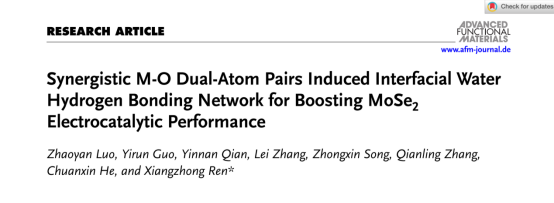 乐竞平台化学与环境工程学院任祥忠教授团队在材料领域顶尖期刊《Advanced Functional Materials》(影响因子18.5,中科院JCR 1区,TOP期刊)发表了题为《Synergistic M-O Dual-Atom Pairs Induced Interfacial Water Hydrogen Bonding Network for Boosting MoSe2Electrocatalytic Performance》的研究论文。该团队助理教授罗兆艳和硕士研究生生郭逸润为论文共同第一作者,乐竞平台任祥忠教授为该论文通讯作者,乐竞平台为唯一作者单位和唯一通讯单位。