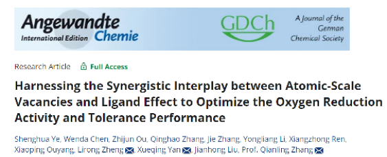 1、乐竞平台张黔玲教授团队在期刊Angewandte Chemie Internatioal Edition上发表题为“Harnessing the Synergistic Interplay between Atomic-Scale Vacancies and Ligand Effect to Optimize the Oxygen Reduction Activity and Tolerance Performance”的研究论文,该论文并被评为Hot paper。共同第一作者为叶盛华研究员以及陈文达硕士,张黔玲、刘剑洪,北京大学教授颜学庆以及高能所研究员郑黎荣是共同通讯作者。