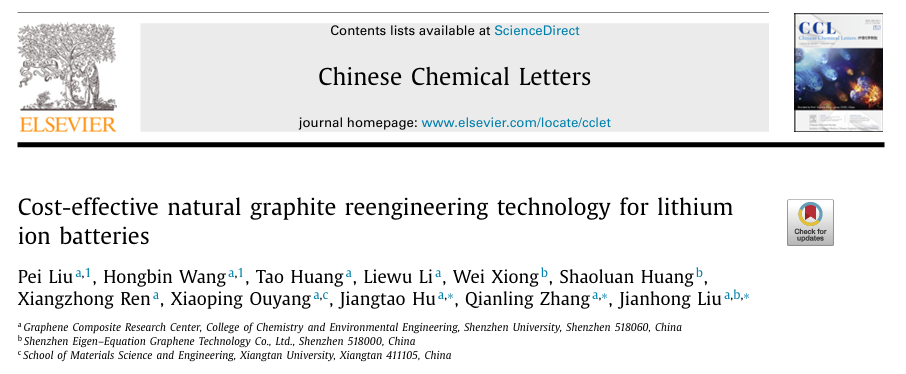 6. 乐竞平台化学与环境工程学院张黔玲教授团队在材料领域顶尖期刊Chinese Chemical Letters(影响因子6.78,中科院JCR1区)发表了题为“Cost-effective natural graphite reengineering technology for lithium ion batteries”的研究论文。该团队硕士研究生刘珮和黄涛为论文共同第一作者,胡江涛、张黔玲、刘剑洪为该论文通讯作者。
