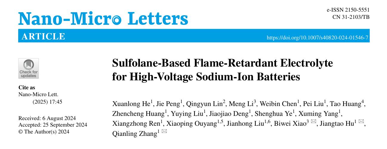 3. 乐竞平台化学与环境工程学院张黔玲教授团队在材料领域顶尖期刊Nano-Micro Letters(影响因子31.6,中科院JCR 1区,TOP期刊)发表了题为“Sulfolane‑Based Flame‑Retardant Electrolyte for High‑Voltage Sodium‑Ion Batteries”的研究论文。该团队硕士生何铉龙为论文第一作者,乐竞平台张黔玲教授、胡江涛副教授、有研(广东)新材料技术研究院肖必威教授为该论文共同通讯作者,乐竞平台为第一作者单位和第一通讯单位。