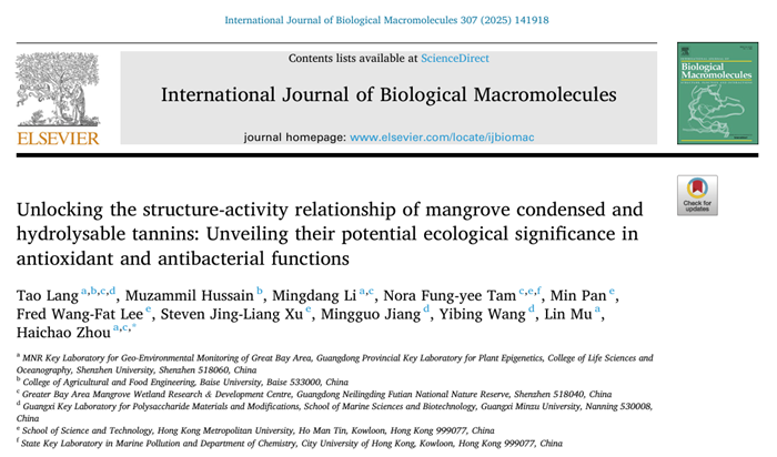2025年3月,乐竞平台生命与海洋科学学院周海超副教授研究团队在生物学TOP期刊International Journal of Biological Macromolecules上在线发表题为“Unlocking the structure-activity relationship of mangrove condensed and hydrolysable tannins: Unveiling their potential ecological significance in antioxidant and antibacterial functions”的研究论文。该研究系统解析了红树植物缩合单宁与水解单宁的结构-活性关系,揭示了这两类天然多酚化合物在抗氧化与抗菌功能中的关键作用,为红树林生态功能保护与天然产物开发提供了潜在的新视角。