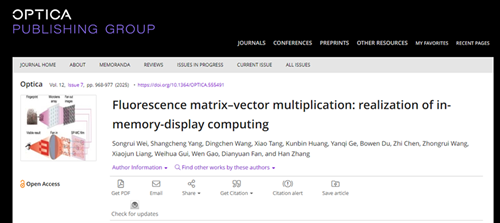 论文信息:Songrui Wei, Shangcheng Yang, Dingchen Wang, Xiao Tang, Kunbin Huang, Yanqi Ge, Bowen Du, Zhi Chen, Zhongrui Wang, Xiaojun Liang, Weihua Gui, Wen Gao, Dianyuan Fan, and Han Zhang; Fluorescence matrix–vector multiplication: realization of in-memory-display computing; Optica 12(7), 968-977 (2025);https://doi.org/10.1364/OPTICA.555491