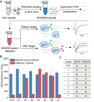 成簇的规则间隔短回文重复序列 (CRISPR) 和 CRISPR 相关 (Cas) 蛋白已广泛用于分子诊断。CRISPR诊断系统主要依靠荧光信号速率的上升来指示目标核酸的浓度,容易受到酶活性、反应条件、仪器性能等多种因素引起的系统误差的影响。因此,建立内部对照对于提高 CRISPR 系统的准确性、可靠性和商业可行性至关重要。然而,与qPCR支持双重荧光通道实现内部控制不同,Cas蛋白的非特异性反式切割活性阻碍了内部控制的建立。在这项研究中,作者构建了带有内部控制的单管单酶CRISPR核酸检测系统 (UNISON)用于精准核酸检测。通过延伸 crRNA 并使用不同的荧光团和淬灭基团对其进行修饰,实现了特异性靶点只能特异性切割相应的折叠crRNA并产生相应的荧光信号。这种设计将内部对照功能整合到 CRISPR/Cas 系统中,实现了对乙型肝炎病毒临床样本的准确可靠检测,对构建稳定可靠的CRISPR诊断试剂体系具有重要意义。
