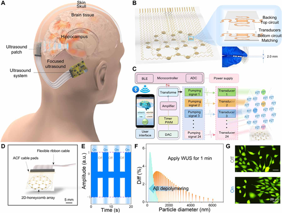 图1. 可穿戴超声系统的组成、电路结构及对阿尔茨海默病治疗的示意图