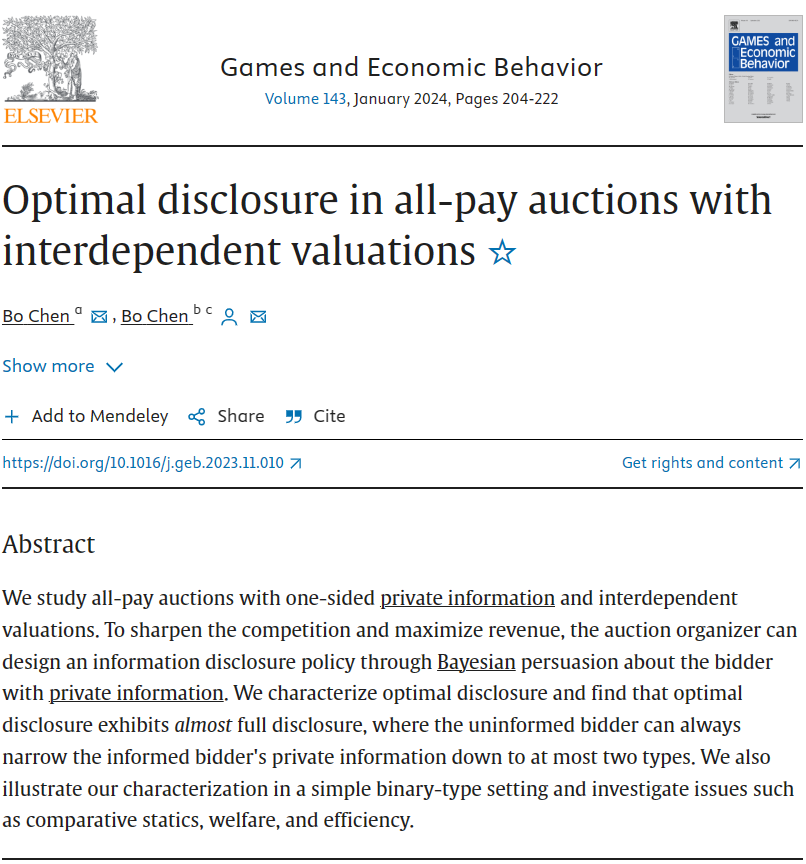 近日,我校经济学院经济系陈博副教授和美国南卫理公会大学陈波副教授共同撰写的学术论文“Optimal Disclosure in All-pay Auctions with Interdependent Valuations” 在博弈论领域国际顶级期刊《Games and Economic Behavior》发表,乐竞平台经济学院为第一完成单位。