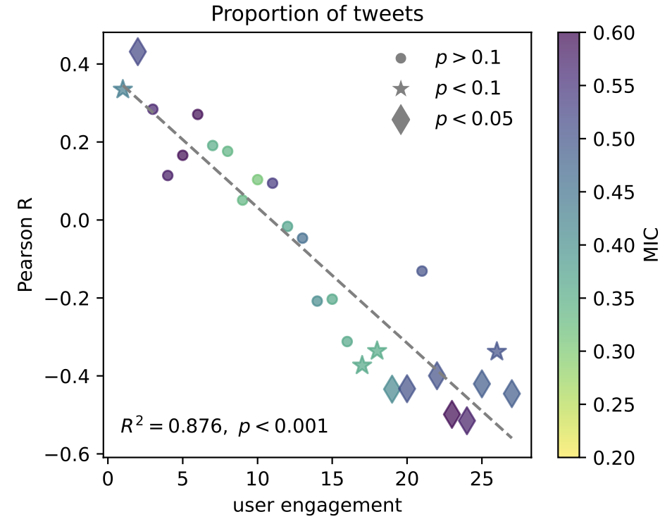 子群体转发比例的演变与整体转发趋势之间的关系,说明参与度越低的子群体在面对外部冲击时表现出更高的敏感度。其中,颜色表示MIC系数,而Pearson相关系数的统计显著性则通过标记表示。虚线代表用于拟合Pearson相关系数结果的OLS线性回归线,R2= 0.876,p < 0.001。