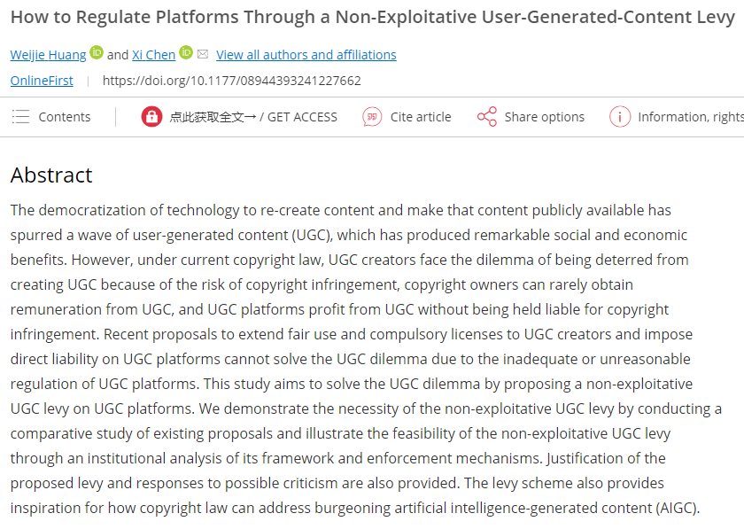 近日,我校法学院黄炜杰老师以第一作者身份、陈曦老师以通讯作者身份,以乐竞平台为唯一署名单位,在Social Science Computer Review合作发表原创性论文How to Regulate Platforms Through a Non-Exploitative User-Generated-Content Levy。Social Science Computr Review(Social Science, Interdisciplinary Q1)属SSCI一区期刊,该刊物2023年影响因子4.1,5年平均影响因子4.7。